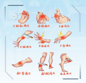 • 慢性痛风石期:形成皮下结节(痛风石),可能导致关节畸形和功能障碍